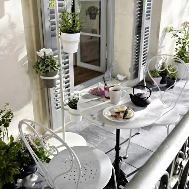 لاستغلال مساحة الشرفة ذات المساحة الصغيرة يفضل اختيار طاولة من الحديد المطاوع ، واختيار الوان تناسب لون البلكونة مع الحرص على اختيار الوان فاتحة حتى تعطي اتساع في المكان وحتى تناسب نمط الشرفة الأنيقة.