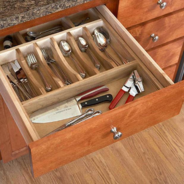 يفضل تصميم أدراج ذات عمق جيد و تزويدها بفواصل و سلال صغيرة لتخزين أدوات المطبخ الصغيرة بشكل منظم .